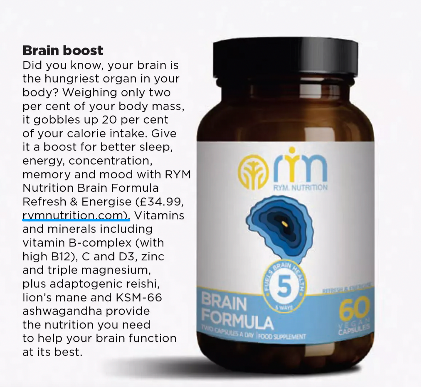 R.Y.M. Nutrition has been featured in Women’s Fitness UK for our commitment to enhancing brain health with natural, science-backed supplements. In the article, the publication highlights our Brain Boost formula, designed to support memory, focus, and mental clarity.
