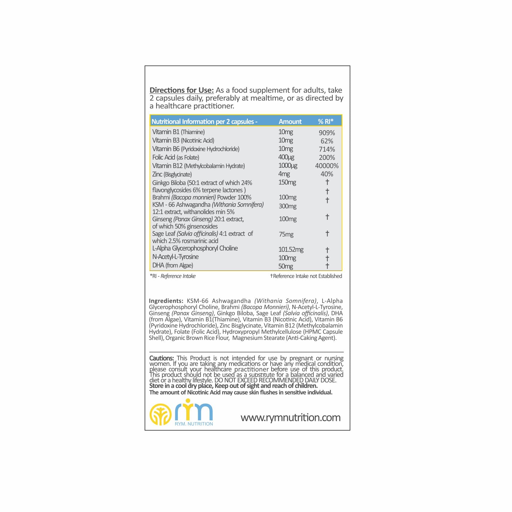 KSM-66 Ashwagandha (Withania somnifera), Empty HMPC Capsule shell (Hydroxypropyl Methylcellulose), L-Alpha Glycerophosphoryl Choline, Brahmi (Bacopa Monnieri), N-Acetyl-L-Tyrosine, Ginseng Stem (Panax Ginseng), Ginkgo Biloba, Sage Leaf Extract (Salvia officinalis), DHA (from Algae), Vitamin B1(Thiamine), Vitamin B3 (Nicotinic Acid), Vitamin B6 (Pyridoxine Hydrochloride), Zinc Bisglycinate, Vitamin B12 (Methylcobalamin Hydrate), Folate (Folic Acid), Bulking Agent (Organic Brown Rice Flour) and Anti-Caking Agent (Magnesium Stearate).